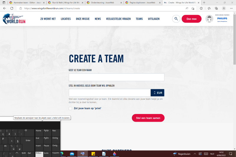 Stap 1: Indien u een team wilt aanmaken, dient u zich eerst zelf in te loggen op de site van Wings for Life World Run. Voor hulp bij registratie of inloggen, kan u terecht op: Individuele inschrijving.